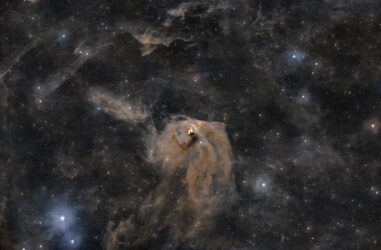 Der geheimnisvolle Reflexionsnebel VdB 152, ein „staubiger Vorhang“ oder auch eine „geisterhafte Erscheinung“, ist wirklich sehr blass. Das kosmische Phantom ist etwa 1400 Lichtjahre und somit weit von Ihrer Nachbarschaft entfernt. Es ist auch als Ced 201 katalogisiert und befindet sich in der nördlichen Milchstraße im königlichen Sternbild Kepheus am Rande einer großen Molekülwolke. Taschen interstellaren Staubs in der Region blockieren das Licht dahinter liegender Sterne und streuen das Licht des eingebetteten hellen Sterns, was einem Teil des Nebels seine charakteristische blaue Farbe verleiht.